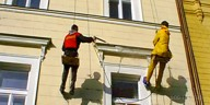 Následné deště často rychle zničí novou fasádu, která ještě před nedávnem zářila do okolí. Příkladem je jeden z objektů na obrázku po omytí fasády tlakovou vodou s následnou dezinsekci s pomocí horolezecké techniky.